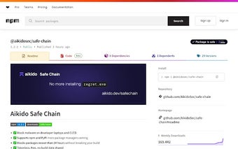Aikido Safe Package, Chrome tarayıcısı için geliştirilmiş bir eklentidir. Ücretsiz olarak sunulan bu araç, npmjs.com üzerindeki paket sayfalarına güvenlik rozeti ekleyerek kullanıcıların paketlerin güvenilirliğini hızlıca değerlendirmelerini sağlar. Bu rozet, her bir paketin güvenli veya kötü niyetli olarak işaretlenip işaretlenmediğini göstermektedir.